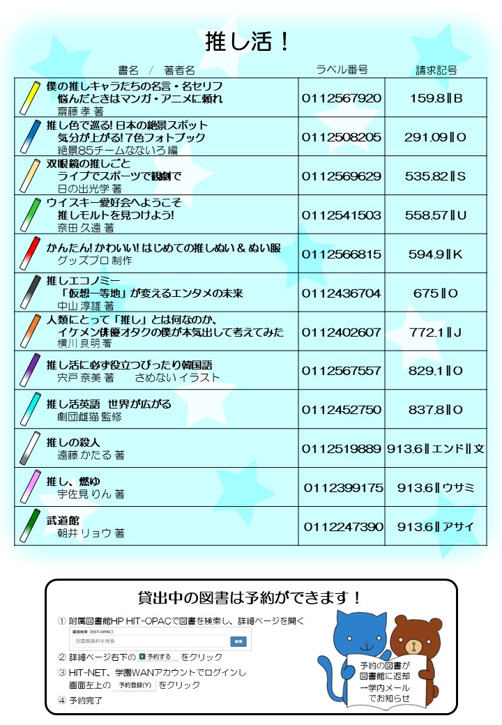 news おすすめ図書コーナーの紹介 2026.04.01 今回のおすすめ図書コーナーは「推し活!」です。さまざまな推し活関連の本を集めています。ぜひ手に取って、あなたの「推し活」の幅を広げてみてください。図書館2Fおすすめ図書コーナーに並んでいますので、ぜひご覧ください。